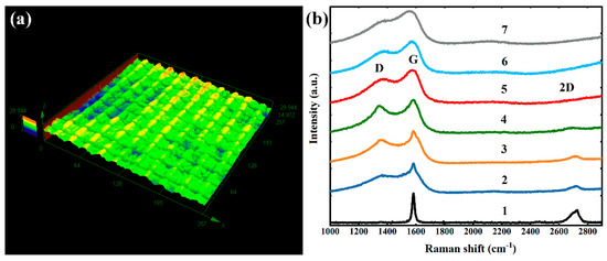 (a) Surface structure fabricated at a pulse energy of 1.52 μJ characterized by confocal laser scanning microscope and (b) Raman spectrum of the sample at different laser pulse energy: 1, untreated graphite surface; 2, 0.26 μJ; 3, 0.52 μJ; 4, 0.93 μJ; 5, 1.52 μJ; 6, 2.06 μJ; 7, 2.58 μJ.
