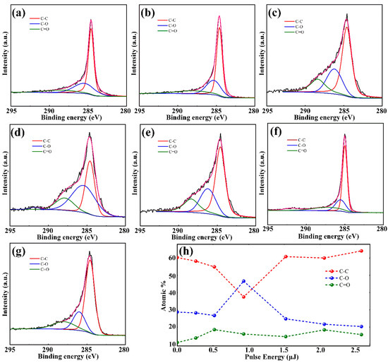 C 1s XPS spectra of the sample at different laser pulse (a) untreated graphite surface; (b) 0.26 μJ; (c) 0.52 μJ; (d) 0.93 μJ; (e) 1.52 μJ; (f) 2.06 μJ; (g) 2.58 μJ. (h) Comparison of the contents of three functional groups changing with pulse energy.
