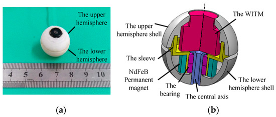 The prototype and cross-sectional view of the DSCR are shown in Figure 1a,b, respectively. The DSCR is composed of the upper and lower hemispheres, in which the upper hemispherical shell, the sleeve, and the NdFeB permanent magnet are consolidated to form the upper hemisphere. The wireless image transmission module (WITM), the central axis, and the lower hemispherical shell are consolidated to the lower hemisphere. The upper and lower hemispheres are connected by the bearing, and they can rotate relative to each other around the central axis.