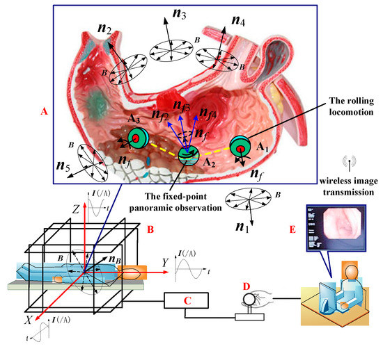 The implementation scheme is as follows: after the DSCR is swallowed and entered the A1 position of the stomach cavity, the doctor adjusts the normal vector of the URMF nB to the horizontal position n1 by manipulating the joystick (D) of the controller (C) according to the real-time image transmitted by the WITM. Under the action of the magnetic torque follow-up effect [32], the axis nf of the DSCR can follow n1 to reach the horizontal position, and then the DSCR works in the active mode, which can realize rolling locomotion on the surface of the stomach.