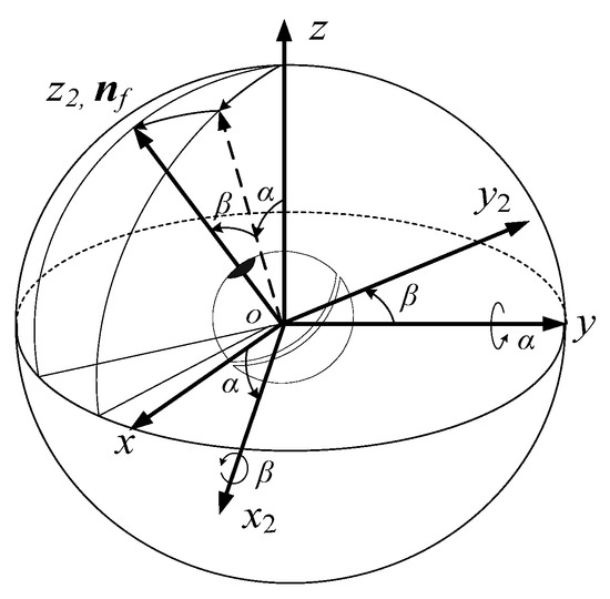 As shown in Figure 3, the posture of the DSCR can be described by the orientation of the oz2 axis of the coordinate system ox2y2z2, which is connected to the lower hemisphere of the DSCR, and the oz2 axis is coincident with the axis nf. The coordinate system ox2y2z2 can be obtained by rotating the fixed coordinate system oxyz around the oy axis by angle α (altitude angle), and then around the ox2 axis by angle β (azimuth angle). Since the rotation along the oz2 axis does not affect the orientation of the DSCR, the posture of the DSCR can be represented by the altitude angle α and the azimuth angle β, and ox2y2z2 is the résal coordinate system. Considering that the DSCR is an axisymmetric structure and the résal coordinate system ox2y2z2 is the principal axis coordinate system, then the axis nf is the polar axis.