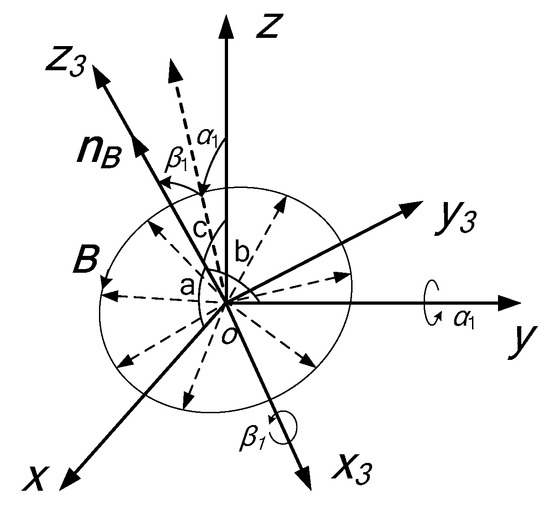 Similar to the rotation relationship of Figure 3, ox3y3z3 can be obtained by rotating the fixed coordinate system oxyz about the oy axis by α1 firstly and then about the ox3 axis by β1, then the oz3 axis can be coincide with nB. Therefore, the orientation of the URMF can be expressed by the altitude angle α1 and the azimuth angle β1.