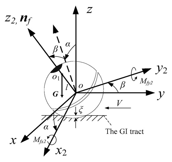 Summing up, the posture dynamic equation describing the electric-magnetic-mechanical-liquid coupling behaviour of the DSCR in the GI tract can be expressed as Equation (18). Moreover, this equation can be classified as an extension of the Lagrangian case for the coaxial bodies system—the fixed-point motion of the coaxial body under the external recovery/overturning moment.