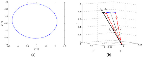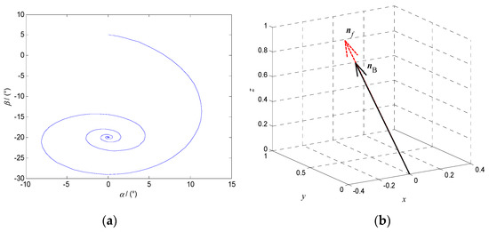 When the modulus of the characteristic multiplier is less than 1, the system phase diagram with the altitude angle α and the azimuth angle β as state variables is an asymptotically stable curve, as shown in Figure 7a. When the system reaches the steady state, the polar axis nf and the target orientation nB coincide in the fixed coordinate system oxyz, as shown in Figure 7b.