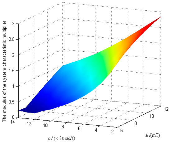 When the angular velocity of the URMF ω and the magnetic induction intensity B vary widely, the variation law of the modulus of the system characteristic multipliers was obtained, as shown in Figure 8.