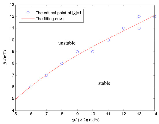 Figure 8 shows that the modulus of the system characteristic multiplier decreases with ω and increases with B. The critical points of Figure 8, which satisfy the modulus of the system characteristic multipliers λ equal 1 was extracted, and the data was fitted by the least square method. Then, the stability domain of the system in the parameter space of ω and B can be obtained, as shown in Figure 9.