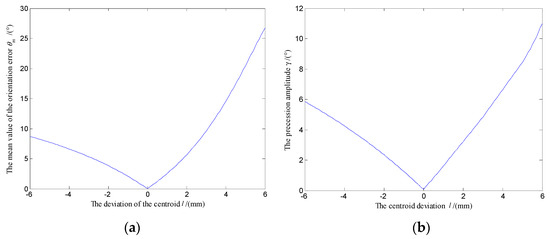 Variation law of the polar axis nf with the centroid deviation l. (a) Variation of orientation error θm with centroid deviation l; (b) Variation of precession amplitude γ with centroid deviation l.