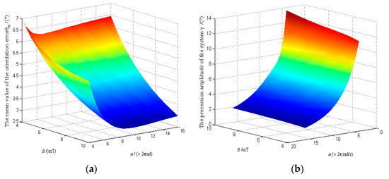 Figure 12a shows that the mean orientation error of the system can be reduced by increasing ω and B simultaneously. While Figure 12b shows that increasing ω and decreasing B can significantly reduce the precession amplitude of the system.