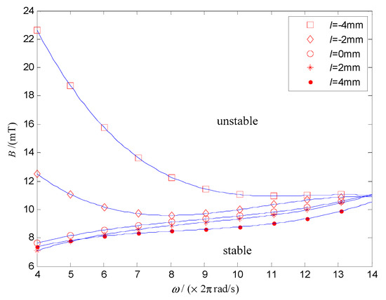 To explore the stability of the DSCR for the periodic motion, taking ω and B as the control parameters, the stability domain of the system under different centroid deviation is shown in Figure 13. The upper and lower areas of the curve represent the stable domain and unstable domain, respectively. Similar to Figure 9, Figure 13 shows that increasing the angular velocity of the URMF and decreasing the magnetic induction intensity can improve the stability of periodic motion of the system.