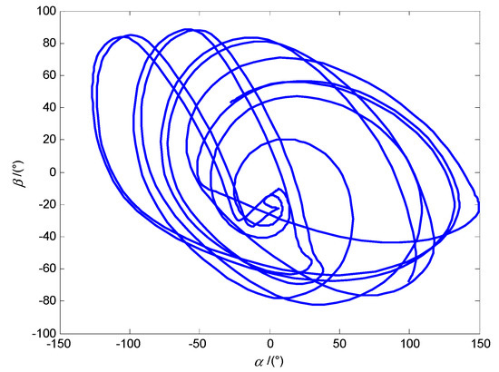 As shown in Figure 14, when the modulus of the system characteristic multiplier is greater than 1, the system phase diagram with the altitude angle α and the azimuth angle β as state variables is chaotic, and the posture of the DSCR is unstable, which corresponding to the control condition of ω = 18π rad/s, B = 12 mT, l = 0 mm.