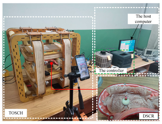 To verify the theoretical analysis results, an experiment platform as shown in Figure 15 was built. The platform consists of the host computer, the controller, the TOSHC, and the DSCR. When the angular velocity of the UMMF ω, the magnetic induction intensity B, and the orientation of the URMF nB are input to the host computer, the controller can generate three-phase electric power that meet the control requirements, and the URMF can be generated after the three-phase alternating current are fed into the TOSHC. Since the orientation of the URMF can be controlled by the direction cosine of nB, and the axis nf of the DSCR can follow nB to change its orientation, then the posture of the DSCR can be controlled by nB. In order to simulate the environment of the GI tract, the isolated porcine intestinal tissue was spread on the surface of the stomach model.