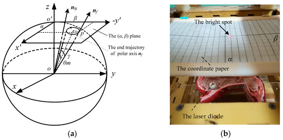 The schematic diagram and physical diagram of the orientation measuring device of the polar axis nf are shown in Figure 16a,b, respectively. As shown in Figure 16a, the unit sphere with the DSCR spherical center o as the coordinate origin, and the unit sphere is intersected with the oz axis of the fixed coordinate system oxyz at the point o’. The tangent plane (x′, y′) of the unit sphere is parallel to the plane (x, y). According to Figure 3, the coordinates of the point p, which is the intersection point of the polar axis nf and the (x′, y′) plane can be obtained as
