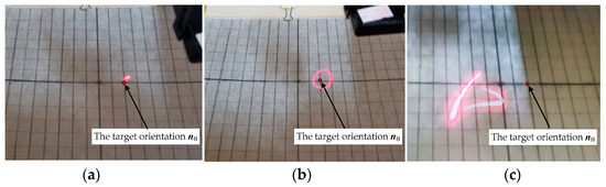 As shown in Figure 16b, the wireless image transmission module of the DSCR was replaced with a laser diode. The coordinate paper is placed at h = 100 mm above the sphere center of the DSCR. The bright spot of the laser diode on the coordinate paper can reflect the end motion trajectory of the polar axis nf in real time, and the trajectory can be recorded by the camera. The horizontal and vertical axes of the coordinate paper correspond to the altitude angle α and the azimuth angle β, respectively. Moreover, each scale on the coordinate paper represents 10°.