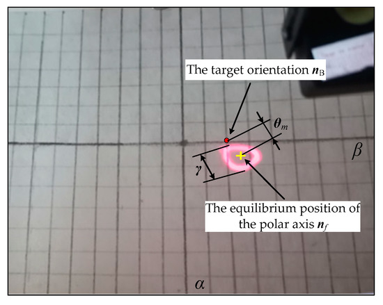 Figure 17a shows that the end motion trajectory of the polar axis nf is a fixed point when ω = 18π rad/s, B = 7 mT, which indicates that the system is asymptotically stable and the polar axis nf coincides with the target orientation nB. While Figure 17b shows that the end motion trajectory of the polar axis nf is a curve of the periodic motion when ω = 14π rad/s, B = 7 mT, which indicates that the polar axis nf makes the precession motion around the target orientation nB. Moreover, the end motion trajectory of the polar axis nf in Figure 17c is an irregular curve, indicating the chaotic motion of the system for the control parameters of ω = 18π rad/s, B = 12 mT. The above three groups of experiment results are consistent with the results in Figure 9.
