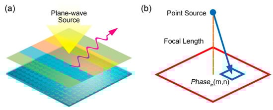 As shown in Figure 1, we presented a metasurface antenna system composed of a reflected surface with reconfigurable liquid metal on it and a feed antenna. When the incident wave from the feed antenna is reflected by the specific metal structure, the desired phase distribution is generated, as illustrated in Figure 1. According to the length from the phase center of the antenna to the different elements, the relevant phase distribution on the surface is obtained easily according to the equation below, as we exhibited in Figure 1b.