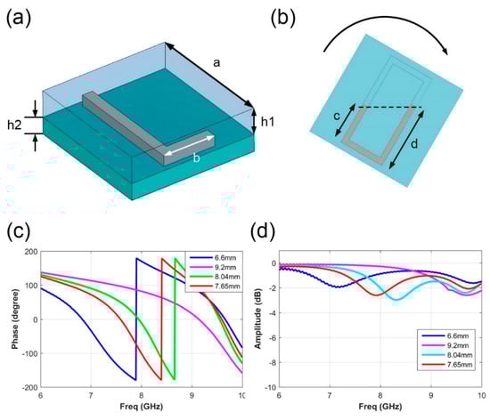 To achieve the flexible phase-reconfigurable capability, we designed a metasurface element with a rectangular-ring cavity to contain the liquid metal and guide it into the desired shape. The detailed element structure is presented in Figure 2a. In the upper layer, the cavity structure of the element is polyamides within three-dimensional printing technology, whose permittivity is 3. Eutectic gallium indium (EGaIn) alloy with a melting point around room-temperature is employed for the desired shape reconstruction. The designed dimension of the element structure is provided as follows: a = 12 mm, b = 5mm, c+d = 12 mm, h1 = 2.5 mm, h2 = 1.6 mm. The alloy shape reconstruction method was first melted under a heating temperature a little higher than its melting point. Then we rotated the element at a certain angle to make the liquid metal flow into the specific size, as shown in Figure 2b. After the alloy reaches the target dimension, we cool the metal to fix its shape. To simplify the control states of liquid metal, we design four states with the liquid metal length as follows: (1) d = 6.6 mm, (2) d = 9.2 mm, (3) d = 8.04 mm, (4) d = 7.65 mm. These four states relate to the 2-bit phase responses as 0°, 90°, 180°, and 270°, theoretically. To simply express the phase states of these four responses, we encode them as 0, 1, 2, and 3, respectively. Figure 2c,d list the simulated phase and amplitude response for reflection wave. The element simulations are performed in a commercial software, CST microwave studio. The periodic boundary condition and linear polarization incidence are applied in the simulations. From the curve data, we can clearly observe that the reflected amplitude responses of four states are all above −3 dB, promising a fair reflection efficiency under plane wave incidence. It should be noted that the reflection efficiency can be further improved by applying the material with lower loss. The phase responses are provided in Figure 2c, in which the four states are labeled in different colors, respectively. The simulated four states exhibit 170.2°, 81.8°, −11.4°, −101.1° at 8 GHz, whose phase difference is about 90°. To indicate the phase arrangement on the reflecting surface clearly, we have used the phase code “0”, “1”, “2”, and “3” to represent these four phase states.