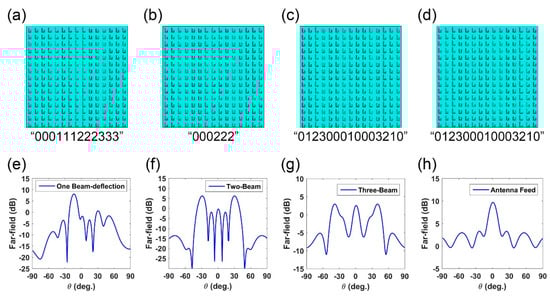 The architecture of the presented metasurface antenna is already shown in Figure 1. A metasurface array composed of 15 × 15 elements is designed and simulated in CST. Two feed source schemes are applied to demonstrate the scattering field manipulation performance. One is plane-wave excitation while the other applies micro-strip antenna as feed, as showed in Figure 1a,b, where the focal length of the antenna feed is set as 60 mm. For the plane wave incidence, we design three phase distributions to realize beam-deflection, dual-beam, and trinal-beam, respectively, as listed in Figure 3a–c. For the point source incidence, we designed a phase distribution, as shown in Figure 3d, to obtain a nearly consistent phase distribution on the reflection surface. To demonstrate their performance, we performed the full-wave simulation in CST to test the scattering fields. The related far-fields simulation data is presented in Figure 3e–h, in which the open boundary condition is applied in all schemes. In Figure 3a–c, four phase distributions are designed as “0001112223333”, “000222”, and “012300010003210”. In Figure 3a, the single beam scattering direction is at about 20° based on the gradient phase distribution. For the dual-beam scattering field, the two main beams point at about 30° when applying phase code “000222”. As the designed metasurface has a 15 × 15 unit array, the code “000222” fills the array as “00022200022200” along the x-axis while keeping the same phase state along the other direction (y-axis). Other phase codes follow the same arranging method. The phase distributions in Figure 3c,d are the same, but their excitation feeds are different. Figure 3g presents the far-field result under plane-wave illumination, where a three-beam scattering field is clearly observed. Figure 3h presents the far-field result under micro-strip antenna feeding, in which the beam gain is about 10 dB.