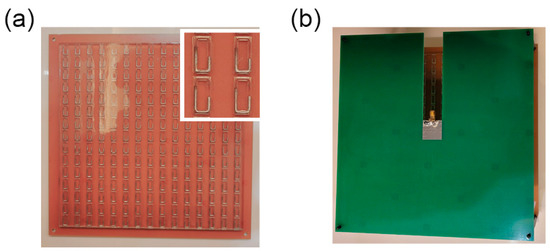 In the experimental verification, we fabricated a 15 × 15 metasurface sample to demonstrate the design we presented above. Since the metasurface is composed of two substrate layers, we fabricated the bottom substrate layer and upper polyamides layer into one piece. The bottom substrate, FR4, and the bottom metal layer are all fabricated together into one board within Printed Circuit Board (PCB) technology. The transparent polyamides containing liquid metal is fabricated based on 3D printing technology, where the rectangular-ring cavity is sculptured on the substrate. Each cavity is injected with a certain amount of melted EGaIn alloy to construct the designed metal structure. After the liquid metal solidifies, we tightly glue the two dielectric plates together. It is worth mentioning that single element manipulation is possible if we can use a point heater to melt one element while keeping the surrounding elements at a low temperature. The most time-consuming part is metal shape reconstruction, which mainly depends on the melting time of the liquid metal. In our experiment, the melting time of liquid metal is about 30 s. For a large array modulation, we can apply a fast heating and cooling device to arrange the phase-pattern distribution more quickly. Some other solutions such as phase-pattern optimization reduce the amount of the reconfigurable element each time. By applying several fast heating and cooling devices, we estimate that the melting time can be reduced to less than 10 s, and the average time of the metasurface pattern reconfiguration can be limited to about three minutes. The fabricated sample picture is provided in Figure 4a, in which an enlarged element figure is given. For plane-wave excitation schemes, the metasurface is directly illuminated by a high-gain horn at long distance, to imitate an approximate plane-wave incidence. For microstrip antenna excitation, we fabricated another PCB plate to excite the metasurface. The antenna was set at the central axis and about 60 mm away from the surface. The antenna PCB plate was fixed with the liquid-metal metasurface using polyamide screws, as showed in Figure 4b. The far-field measurement was performed in a standard microwave chamber room. A two-dimensional far-field of the metasurface was tested based on a plane turning table.