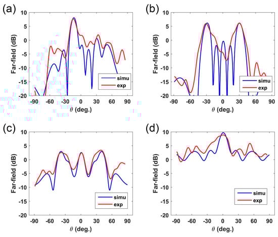 The measurement results are given in Figure 5, in which we perform three phase distributions to respectively demonstrate single-beam, dual-beam, three-beam under plane-wave, and point source excitation. From the measured data, we can clearly observe the single-beam deflection, dual-beam, and three-beam, respectively, in Figure 5a–c when under plane-wave illumination. For microstrip antenna feed, the tested result is showed in Figure 5a, where the gain of the main beam is about 10 dB. Compared to the previous works [15,16,17], the directivity of the presented four schemes in this work is about 10% lower, resulted from the substrate loss of FR4. But this could be improved by using the high-quality substrate with lower loss. Comparing the measured results and simulated results, we can observe a slight difference in the scattering angle of the main beams. The scattering energy in other directions also shows the discrepancy between simulations and experiments. The reasons for these differences mainly include: (1) the fabrication error in polyamides cavity support and manual assembling, which may lead to the error in liquid-metal dimensions; (2) The non-ideal plane wave source from the horn antenna; (3) The manual operation in experimental measurements; (4) The phase center error between simulation and measurements.