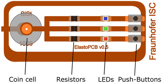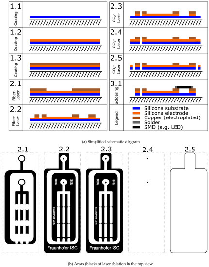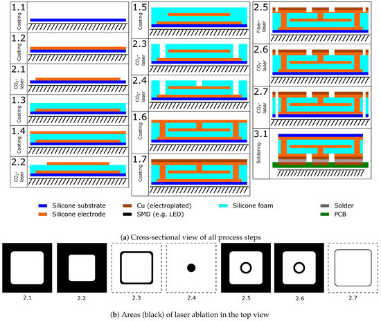 As a first demonstration of the described manufacturing procedures, the laser structuring of a simple stretchable circuit board, which supplies LED with power using a coin cell, was chosen. The schematic representation of the manufacturing process is shown in Figure 1 and the associated manufacturing parameters are depicted in Table 3. For the purpose of clarity, the schematic cross-sectional view shown in Figure 1a does not show the actual structure, but only three representative elements (a through-hole plating, an SMD connection and an expandable area in between). The top view in Figure 1b, in contrast, shows the actual layer geometries.
