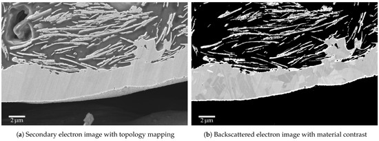 To gain insight into the connection between the metal and the elastomer composite layers, scanning electron microscopic (SEM) images (ZEISS AURIGA 60, Carl Zeiss Microscopy, Oberkochen, Germany; 5 kV acceleration voltage, secondary electron detector and backscattered electron detector) were taken. For this purpose, a piece with dimensions of about 5 mm × 5 mm was cut from the prepared films. After embedding in epoxy resin, it was cut and then grinded and polished to obtain a side view of the metal and composite layer perpendicular to the doctor blading direction in the preparation step. The cut surface was subjected to an ion beam etching to allow for an artifact-free examination. Additionally, a layer with a few nanometers of carbon was sputtered onto the sample to avoid charging effects.