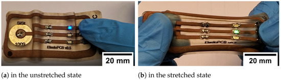 As demonstrated in this work, the good mechanical bonding of the metallic layer to the conductive elastomer layer and its wettability by solder enable the bonding of conventional surface-mounted devices (SMDs) by established soldering processes. In addition to solderability, the metallized sections also allow for localized stiffening, which relieves the strain on the solder joints in the case of circuit carrier elongation. Instead, the strain is absorbed by the sections in which the elastic particle–elastomer composite is not metallized. In particular, capacitive or resistive elastomer sensors and elastomer actuators can be combined directly with the necessary control, evaluation and transmission electronics on an elastic circuit board. In the future, commercially available stiff semiconductor sensors such as temperature, light, humidity, acceleration and position sensors can also be connected with flexible and stretchable conductor paths to attach them to textile or generally moving surfaces (e.g., human skin, robot joints).