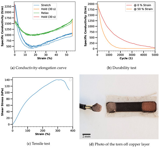 The electromechanical characterization of the laser-manufactured conductor strip yields an initial conductivity of about 2250 S m−1. The conductivity drops to 25% during stretching, but recovers to 75% when the strain is kept constant during the holding time (30 s) (see Figure 6a). In the first stretch cycle, the conductivity is slightly lower, but in the following cycles it remains largely unchanged. In the process of the durability test, the conductivity decreases significantly (see Figure 6b). In the first 100 cycles, the value of the conductivity in the stretched state is higher than the value in the unstretched state. This could be explained by the possible alignment effects of the particles [15]. Subsequently, the value in the stretched state is below the value in the unstretched state and both values continue to decrease. This behavior is not optimal, but corresponds to the previously reported behavior for the specific metal-flake-silicone composite prepared without laser patterning [15]. Thus, the degeneration is not due to the laser patterning or to any detachment of the metallic copper layer, but to the elastic composite itself. To provoke detachment of the copper layer, the specimen was finally stretched to failure. Only when the elastic part of the specimen was stretched by approx. 300% and a shear stress of 140 kPa was applied between the copper layer and the silicone composite, the connection failed (see Figure 6c). On the photograph of the fracture surface (see Figure 6d), which shows a remaining composite layer on both halves of the fracture, it can be seen that the failure does not occur directly between the metal and the composite, but within the composite layer.