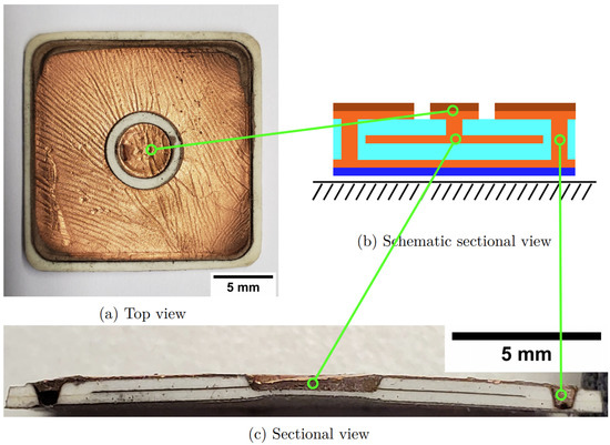 Top view (a), schematic cross-sectional view (b) and cross-sectional view (c) of a manufactured pressure sensor. The insulation ring between the inner and outer electrode is not visible in the cross-sectional view due to the electrode material behind it.