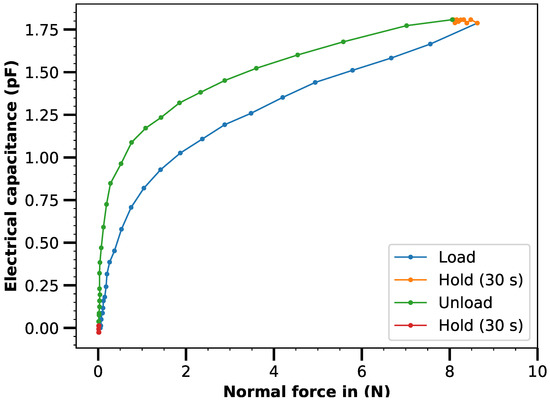 To characterize the fabricated sensor, a force or pressure-capacitance curve was generated. For this purpose, the sensor was placed in a rheometer (MCR501, Anton Paar, Graz, Austria) equipped with a pressure measuring plunger and subjected to an increasing normal force up to about 8 N (corresponding to 25 kPa). The capacitance between the outer and inner electrodes was recorded continuously. After reaching the maximum force, a hold time of 30 s was applied to determine sensor creep. The sensor was then unloaded again and another hold time of 30 s was applied to record a full hysteresis loop.
