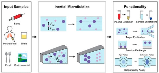 Inertial microfluidics (IM) is an effective translational technology that has proved capable of analyzing real, non-idealized biological and environmental fluid samples (Figure 1). Inertial focusing, the phenomenon that IM utilizes, relies on the balance of hydrodynamic forces to order particles into distinct streamlines within a microchannel based on flowing particles’ intrinsic physical properties. The physics of IM operation and manipulation of relevant forces have been extensively reviewed and can be found elsewhere [1,2,3,4]. In brief, IM utilizes hydrodynamic lift forces arising within microchannels operating at finite Reynolds number (Re > 1), or the ratio of inertial to viscous forces. Competing wall effect lift, shear gradient lift, and Dean drag forces equilibrate flowing particles at different streamlines depending on the properties of individual particles within a complex solution. IM devices are tailored to control these forces and isolate, trap, or concentrate particles with specific physical characteristics. Often, high flow rates are used to ensure the generation of relevant hydrodynamic forces, which provides the added benefit of faster sample processing.