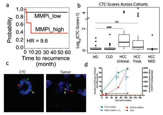 IM CTC isolation provides minimally invasive cancer cell samples for downstream sequencing, enabling longitudinal follow-up studies to monitor disease progression. Data from CTC sequencing depicts mutational profiles that can be aggregated into different scores predictive of patient recovery. Lim et al. passed ClearCell FX-enriched CTCs through a second microfluidic device that separated cells for single-cell sequencing [31]. Analyzing single-cell CTC sequences from non-small-cell lung cancer (NSCLC) patients revealed an improved prognosis of recurrence-free survival (RFS) based on the identification of matrix metalloproteases (MMP) mutations and summarized with the MMP index (MMPi) (Figure 3a). The model led to a 30% reduction in scoring variability and improved stratification of RFS outcomes compared to the existing tumor matrisome index. Miyamoto et al. employed droplet digital polymerase chain reaction (ddPCR) on CTC-iChip isolated CTCs to predict patient outcomes using Androgen Receptor (AR) signal outputs [32]. Expression of AR-related genes led to the subcategorization of “high-risk” metastatic castration-resistant prostate cancer (mCRPC) patients with poor overall survival rate using a scoring system. Similarly, Rzhevskiy et al. isolated localized prostate cancer tumor cells shed into patients’ urine using a slanted spiral microchannel [33]. Subsequent analysis revealed a positive correlation between cancer cell count and both the Gleason score and blood prostate-specific antigen (PSA) levels, the two gold-standard assays for prostate cancer prognosis. Kalinich et al. used a CTC-iChip to isolate CTCs and performed whole transcriptome amplification prior to ddPCR [34]. Transcriptome amplification signals were aggregated into a single CTC score that could accurately classify individuals with active disease (Figure 3b). In addition, combining CTC score analysis with the monitoring of alpha fetoprotein (AFP) levels in serum yielded as high as 86% positive predictive value of early hepatocellular carcinoma (HCC) detection in high-risk patients, which is drastically higher than the 6% positive predictive value of AFP levels alone. A similar CTC score was developed for melanoma using 19 related genes, as determined through CTC-iChip and ddPCR processing of patient samples [35]. Patients with a decrease in score after immune checkpoint inhibition therapies also had better progression-free survival, suggesting a predictor for a disease with few universal markers. These studies illustrate how IM supports downstream sequencing, which has the clinical utility to assess patient conditions.