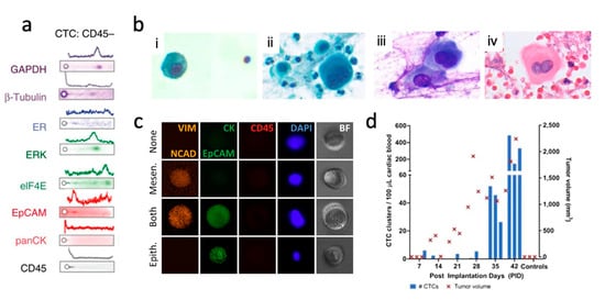 Label-free CTC isolation is necessary for unbiased CTCs studies. (a) Patient-derived single-CTC lysate is analyzed by single-cell Western blotting and rounds of immunoprobing against a wide array of signaling and onco-proteins relevant to cancer. Reprinted from [61]; permission conveyed through CC BY 4.0. (b) The cytological analysis revealed that CTC (i) revealed binucleation, which was also seen in a Pap stain (ii) and MGG stain (iii) of the patient’s pleural fluid and H&E stain (iv) of a primary tumor sample. Adapted from [50]; permission conveyed through CC BY 4.0. (c) Immunofluorescence staining of mesenchymal (VIM, NCAD) and epithelial (CK, EpCAM) markers revealed cellular heterogeneity. CTCs (CD45-) may or may not express these markers, depending on their EMT status. Reprinted from [68]; permission conveyed through CC BY 3.0. (d) Relationship between tumor volume with elevated CTC clusters counts per 100 μL of cardiac blood in a xenograft mouse model. Reprinted from [69]; permission conveyed through CC BY 4.0.