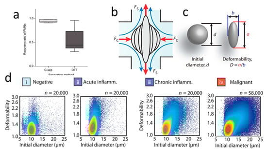 Congenital heart failure, cirrhosis, tuberculosis, and other bodily diseases generate pleural effusions (PEs), the excess fluid buildup in the lining of the lungs [115]. Malignant pleural effusions (MPEs) describe particularly dire cases where malignant cancerous cells infiltrate the pleura, occupying 4–12% of the approximately 1.7 × 103 WBCs/mL in PEs [116]. Fluorescent labeling techniques have been used to differentiate cells found in PEs and determine the underlying illness, but these methods are hampered by high false-positive rates and lengthy processing times [114]. Gossett et al. and Tse et al. developed a method for IM-assisted deformability interrogation and interrogated infiltrating WBCs in PEs as an attractive alternative for rapid assessment of patient status [103,114]. Cells collected from PEs were hydrodynamically deformed in a high throughput manner, and populations were plotted based on deformability and initial cell size at single-cell resolution (Figure 5b,c). Upstream inertial focusing with an asymmetrically curved channel ensured high accuracy by standardizing cell position prior to deformation and minimizing interference from other cells during deformation. PE samples could be classified based on deformability trends, prompting further patient testing for acute/chronic inflammation and MPEs (Figure 5d). Data collected from this device identified fractions of non-WBC infiltrating cells in PE samples and helped estimate the likelihood of the sample containing metastatic cancer cells. Amongst 116 patients with PEs, Tse et al. reported that the deformability analysis properly screened 56 (47%) patients as negative and 19 (16%) patients who were positive for malignant cells. Integration of this device into the sample analysis pipeline could reduce the number of false positives and the need for follow-up screenings [103].