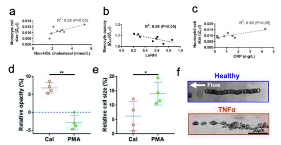 Interpretation of results from impedance measurements (a–c). Correlations between (a) monocyte cell size and cell lipid content, (b) monocyte opacity and vascular function as measured by logarithm of reactive hyperemia index (lnRHI), (c) neutrophil size and CRP levels. Panels a-c reprinted with permission from [96], Copyright 2018 with permission from Elsivier. Changes in neutrophil (d) opacity, and (e) size when treated with calcium ionophores (CaI) and phorbol 12-myristate 13-acetate (PMA) to stimulate NETosis. Both figures are normalized to a control of unstimulated neutrophils. Panels d-e reprinted used with permission of MDPI, from [97]; permission conveyed through Copyright Clearance Center, Inc. (f) Time lapse captures showing the difference between a healthy rolling profile (top) and the discontinuous cell “flips” when treated with TNF-α (bottom), panel used with permission of Nature Publishing Group, from [99]; permission conveyed through CC BY 4.0.