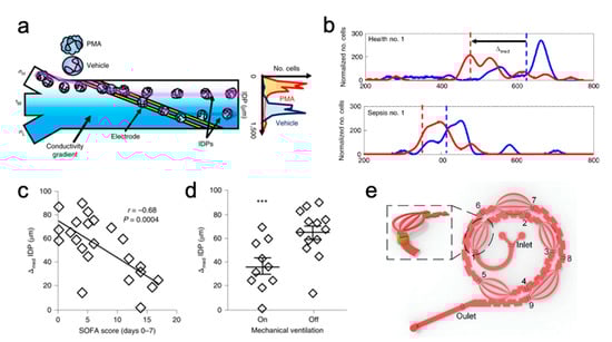 Downstream isodielectric point (IDP) assay, and 3-D geometry for RBC lysis. (a) Illustration of the microfluidic channel used to determine the isodielectric point), as well as peak locations for cells treated with an activating agent versus just the drug carrier. (b) Example of Δmed calculations between healthy donors (top) and septic patients (bottom). The focusing positions shown are of PMA activated cells (red) vs. cells exposed to the vehicle (blue). Plots showing the correlation (c) between the Δ med and SOFA scores over 7 days of patient treatment (d) between the ∆med and the need for mechanical ventilation. Panels a – d reprinted with permission from [94], Copyright 2019 Springer nature. (e) Schematic of the lysis module showing the 3-dimensional channel from the inertial microfluidic cube used for mixing the lysing agent and whole blood. The enlarged section shows the 3-D flow path, panel used with permission of Royal Society of Chemistry, from [100]; permission conveyed through Copyright Clearance Center, Inc.