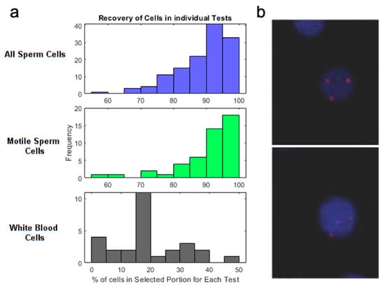 Assistive reproductive technologies (ART) is a class of therapies used to treat infertility. ART used to treat male infertility requires the accurate assessment of sperm, WBC, and RBC counts in seminal fluid extracted via a surgical procedure, testicular sperm extraction (TESE) [126,127]. Previously, microfluidic devices relied on sperm motility for separation, often discarding viable sperms with low motility, thus leading to inaccurate assessment of viable sperm counts in the sample [128]. Son et al. used a spiral microchannel to purify viable sperms from seminal fluids and achieved 80% recovery of sperm while removing 92% and 87% of WBCs and RBCs, respectively, using donor sperm samples spiked with blood cells to replicate pyospermia (high WBC semen) [129,130,131,132]. Overall, IM isolation of sperm demonstrated an almost nine-fold increase in sperm recovery than other conventional methods (e.g., centrifugation, manual sorting) and an 81% increase in the capture of non-motile sperm compared with non-inertial microfluidic sperm isolation systems [133,134,135,136]. Additionally, unaltered viability observed in sperms 30 min after the process suggests the possibility of reprocessing samples for further enhancement of purification and enrichment [134,137]. By separating both motile and non-motile viable sperms with high efficiency and purity, these IM devices showed promise for automatable sample preparation and the possibility to incorporate downstream assays, such as sperm motility assay. Finally, the group optimized a sperm separation protocol to be used with intrauterine insemination. Compatibility of isolated sperm with intrauterine insemination is assessed using the three criteria: injection volume less than 1 mL, no WBCs, and removal from seminal plasma [136]. Jafek et al. developed a pipeline consisting of a single centrifuge wash and subsequent run through a microfluidic chip, showing an average recovery rate of 90% across 130 tests (Figure 8a, top) of the motile sperm, and meeting all the criteria for intrauterine insemination [138]. The purified sample only retains on average 18% (Figure 8a, bottom) of WBCs and is washed of seminal plasma, with the final volume < 1 mL, showing promise for intrauterine insemination.
