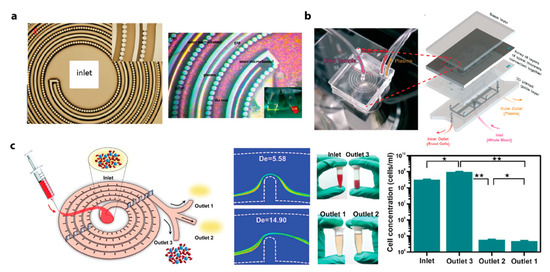 Ideally, there is a single equilibrium position of cell streams for effective plasma extraction [151,152,153]. However, particles with different sizes tend to focus at different positions in a straight channel with a rectangular cross-section because inertial lift forces strongly depends on the size. Since forming a single focusing-stream of polydisperse particles like blood cells (RBCs, WBCs, platelets) in a simple straight channel is challenging [153], micro features, such as rectangular cavities or slanted grooves, were used to induce secondary flow (i.e., Dean flow) to create single focusing stream [137,148,154,155]. Curved channels, such as serpentine and spiral microchannels, are also effective for such a purpose. Dean drag forces can accelerate the focusing process [153], so the spiral microchannel design benefits from a smaller device footprint. Various channel cross-sections (e.g., low-aspect-ratio rectangular and trapezoidal) and various microfeatures (e.g., micropillar filters, microbar obstacles) were employed to further enhance plasma separation [151,152,153,156,157,158].