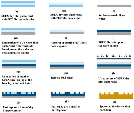 - Johnsona, D.W.; Goettertb, J.; Singhb, V.; Yemaneb, D. SUEX Dry Film Resist@—A new Material for High Aspect Ratio Lithography. Mater. Sci. 2012, 1–8. Available online: http://citeseerx.ist.psu.edu/viewdoc/citations;jsessionid=EB01E22031092747832A299026577D26?doi=10.1.1.651.3557 (accessed on 10 January 2021).