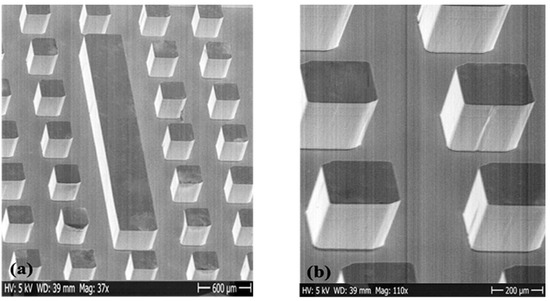- Kukharenka, E.; Farooqui, M.M.; Grigore, L.; Kraft, M.; Hollinshead, N. Electroplating moulds using dry film thick negative photoresist. J. Micromech. Microeng. 2003, 13, S67–S74. [Google Scholar] [CrossRef]