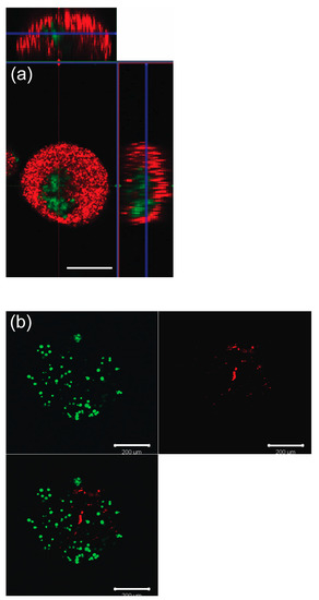 Correct spatial distribution after encapsulation was confirmed both in beads and cells (Figure 3a,b).