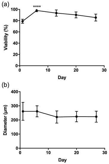 The diameters of the capsules were measured. A Kruskal–Wallis test showed no significant change in diameter during 27 days of culture (p = 0.216) (Figure 4b).