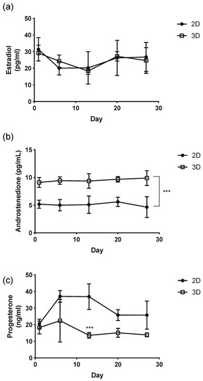 Hormone level as a function of time by co-cultured granulosa cells with theca cells in a 2D and 3D system. (a) Estradiol, (b) Androstenedione, (c) Progesterone. The figures represent data from three separate experiments.