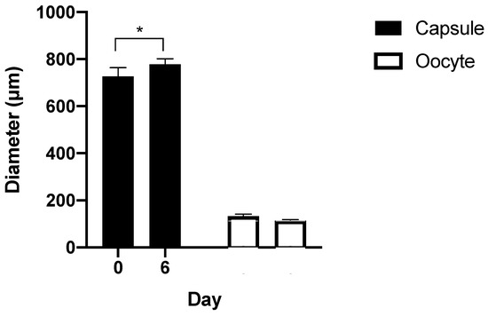 Oocytes were collected by gently puncturing follicles from the isolated ovaries with a 29-gauge needle. Oocytes from primary and early secondary follicles were identified and collected in Leibovitz’s L-15 medium supplemented with 10% (v/v) FBS and 100 mg/mL streptomycin sulfate and 100 U/mL penicillin [33]. Once collected, they were placed into the microfluidic device for encapsulation via the oocyte channel with a flow rate of 100 uL/hr (Figure 1b). Capsules were placed in growth media [MEMα: DMEM/F12 1:1 supplemented with 10 mIU/mL rFSH, 3 mg/mL bovine serum albumin, 100 mg/mL streptomycin sulfate and 100 U/mL penicillin (Thermo Fischer Scientific), 1 mg/mL bovine feutin, 5 μg/mL insulin, 5 μg/mL transferrin and 5 ng/mL selenium (Sigma-Aldrich, St. Louis, MO, USA)] and half of the media was changed every 2 days. The size and gross appearance of the oocytes were evaluated using a dissecting microscope [34].