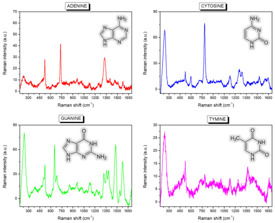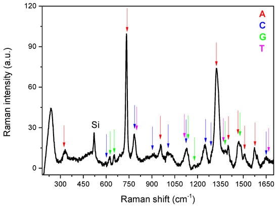 Moreover, the spectrum corresponding to the mixed sample presented in Figure 3 clearly shows a correct superposition of all the various bands, indicated by the arrows and attributed to the four bases using a colour code, making it possible to conceive the method to also analyse specific DNA sequences.