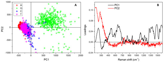 Figure 4. (A) Score plot resulting from the Principal Component Analysis performed on the spectra composing the Raman map acquired on adenine (red squares), cytosine (blue circles), guanine (green upward triangles) and thymine (magenta downward triangles) samples. (B) Spectral loadings corresponding to the first two principal components.
