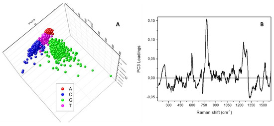 Nevertheless, it is possible to use a different representation of the results of the PCA analysis to also separately identify and examine the clusters composed of the data coming from A, C and T sample maps. To this aim, Figure 5A reports a three-dimensional visualisation of the PCA scores obtained by using the first three principal components. The clouds appearing superposed in Figure 4A, are distributed and distinguishable along the third component PC3, whose spectral loadings are shown in Figure 5B. In this case, the relevant parameters coming from the statistical analysis are the main intense bands ascribable to the ring stretching and breathing modes of the bases, locating the A cluster in the PC3 negative half-plane (negative loading at about 735 cm−1) and the C cluster in the PC3 positive half-plane (positive loading at about 785 cm−1).