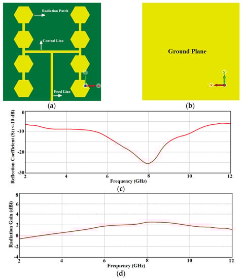 The configuration of the reference antenna array shown in Figure 1a,b consists of a 2 × 4 matrix of hexagonal patches that are interconnected to each other with a high impedance microstrip-line. The bottom side of the substrate is a ground-plane as shown in Figure 1b. The array is excited through a common central feedline. The patches in the array are based on a standard design and its performance was simulated and optimized using CST Microwave Studio. The array was fabricated on the FR-4 substrate with dielectric constant of 4.3, tan of 0.025, and thickness of 0.8 mm. The thickness of the conductive layer made of copper is 0.035 mm. The total dimensions of the antenna are 20 mm × 20 mm × 0.87 mm. Geometrical parameters of the optimized array are listed in Table 1. The reflection-coefficient response of the reference antenna array in Figure 1c shows that it operates over 5.25 GHz to 10.1 GHz corresponded to 63.19% practical bandwidth, which falls short for UWB systems defined between 3.1 GHz to 10.6 GHz. Figure 1d show the average radiation gain of the array across its operating band is 1.5 dBi.