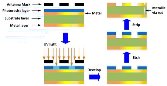 The fabrication of the antenna is made by standard photo-lithographic method based on a chemical etching process as illustrated in Figure 2. This involves the removal of the unwanted conductive regions of the metallic layer. The photo-lithographic process uses light to transfer the antenna pattern from a photomask to a photosensitive chemical photoresist on the substrate. The thickness of the photoresist layer is typically 1 micron. A series of chemical treatments is performed to etch the exposure pattern on the metal. This procedure is comparable to a high precision version of the method used to make printed circuit boards. Precision of this technique is typically down to less than 2 microns and the repeatable accuracy is ±10 microns, which means that the fabrication method will have negligible effect on the performance of the antenna whose dimensions are specified in Table 1. The vias are created using the standard through-hole technology. This involves drilling a hole through the dielectric substrate which then needs to be cleaned of debris from the drilling operation before a conductive wire is inserted through it. The wires are cut to size and both ends of the wire are soldered to the microstrip surface to create an electrical short circuit. Alternately, through-hole plating process can be used to metallize the via-holes. Through-hole plating involves chemically coating the holes with a thin layer of copper through a process called electroless copper deposition. This gives the copper plating a base to build up from. The full amount of copper is then electroplated in the via holes by connecting the board to an electrical charge so that the boards act as cathodes for the electroplating process.