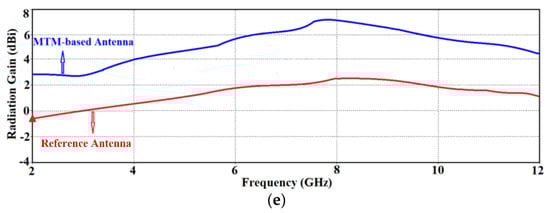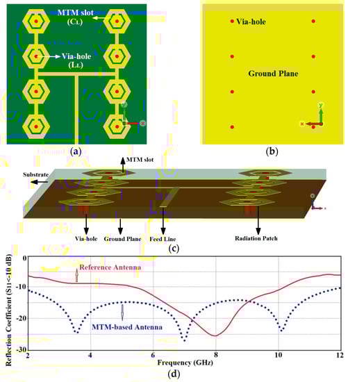 The bandwidth of the reference antenna array defined for S11≤−10 dB in Figure 1 is between 5.25 GHz to 10.1 GHz. This partially covers the required UWB spectrum defined by the American Federal Communications Commission (FCC) to be between 3.1 GHz to 10.6 GHz. Therefore, it was necessary to extend the array’s bandwidth to fulfill the UWB bandwidth criteria. This was achieved by incorporating CRLH structure in the hexagonal patches of the reference antenna array. This involved etching a hexagonal slot in the radiating patch and inserting a metallic via at the center of the patch to ground it, as shown in Figure 3a–c. Geometrical parameters of the optimized array are listed in Table 2. The hexagonal slot in the radiating patch essentially acts like a series left-handed capacitance, and the metallic via acts like a shunt left-handed inductance. Moreover, surface currents that flow over the antenna establish parasitic right-handed capacitance between the patch and the ground-plane, and series right-handed inductance on its surface. This modification essentially introduces metamaterial characteristics in the reference antenna. The consequence of this is significant improvement of the impedance bandwidth as well as the radiation gain over the UWB spectrum as is confirmed by the simulation results in Figure 3d,e. The reference antenna’s impedance bandwidth for S11≤−10 dB is extended from between 5.25 GHz and 10.1 GHz to between 2 GHz and 12 GHz, which corresponds to a fractional bandwidth of 142.85%. Compared to the reference array this constitutes a bandwidth improvement of 80%. The corresponding average gain improved from 1.5 dB to 5 dBi.