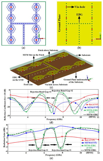 Layout of the proposed MTM based antenna array loaded with electromagnetic bandgap (EBG) slots: (a) top-side of substrate, (b) back-side of substrate (ground-plane), (c) isometric view showing the structural components and their locations, (d) reflection coefficient response comparison of the reference, MTM, and MTM with EBG loading, and (e) radiation gain of the reference, MTM, and MTM with EBG loading.